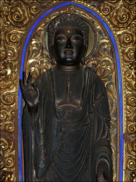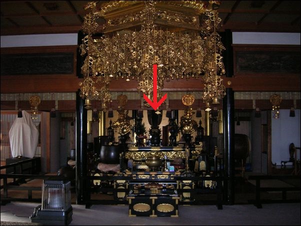 これが、充国寺の本堂の中。赤い矢印が、胸割り阿弥陀。