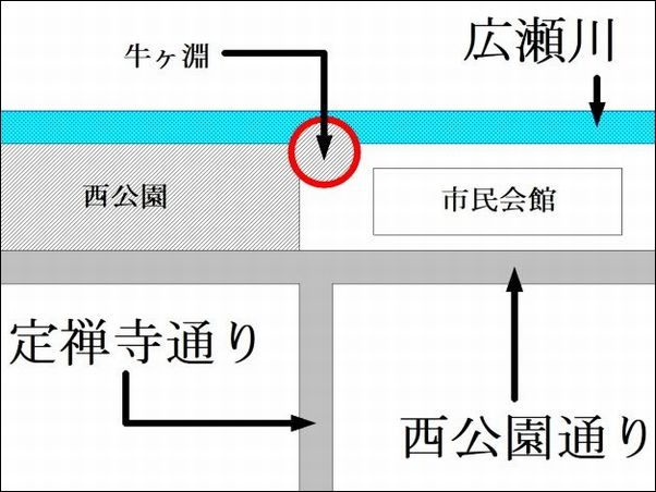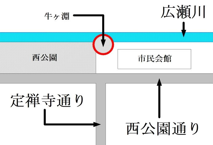 これが、牛ヶ淵の全体図。定禅寺通りと、西公園通りが交差する点にある。