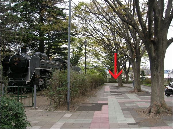 これが、定禅寺通りと、西公園通りが交差する点。赤い矢印が、牛ヶ淵のある崖。