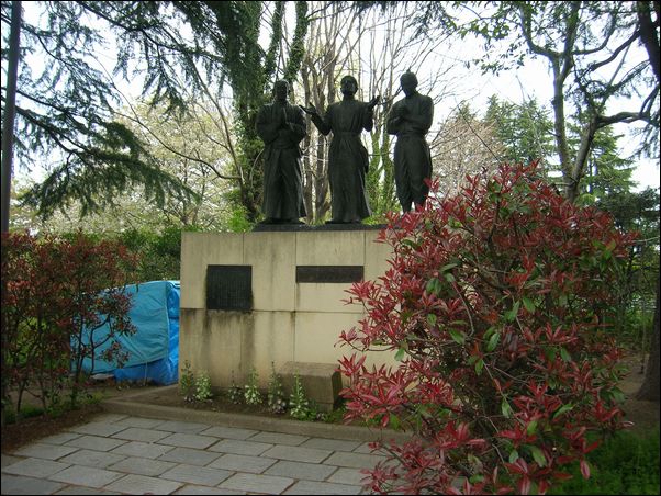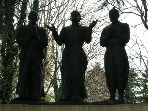 中央がカルバリオ神父。左が武士。右が農民。武士と農民は、ここで殉教した者の象徴だという。因みに、カルバリオ神父の日本名は長崎五郎右衛門。