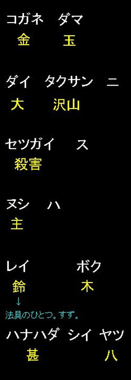 昔、 南部 に 金玉 という盲人の僧がいた。金玉は、 座頭 の官位をいただくために、多額の金をもって京の都へ行こうとしたのだが、 大沢 にさしかかったとき、ある 追剥ぎ に襲われた。金玉は、「 今、殺されるのは、悪縁としてあきらめる。せめて、お前の名前だけでも聞かせてくれ 」と頼み、その名前を聞くと、「 これから毎日、『 コガネダマダイタクサンニセツガイスヌシハレイボクハナハダシイヤツ 』と唱えて、私を弔ってくれ。もし、唱えてくれなかったら、必ず、祟るぞ! 」と叫んだ後、この追剥ぎに殺され、すべての金を奪われた。 南部では、いつまで待っても金玉が帰らないので、心配した弟子たちが、京の都に捜しに向かったのだが、たまたま滞在した大沢の宿で、「 コガネダマ… 」という聞いたことのない経文を唱える者に遭遇した。「 なんだ?この意味の分からない経文は… 」と思いながら、弟子たちが、その経文を聞いていると、弟子の一人が、「 あっ! そうだったのか! 」と叫んだ。 ![]()