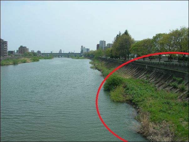 赤丸のあたりが、鎧淵。宮沢橋から撮影した。遠くに見えているのが、広瀬橋。