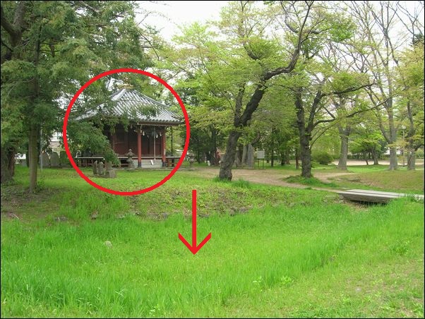 これが、観音堂の近くに掘った池。現在、水はない。赤丸が、準胝観音堂。