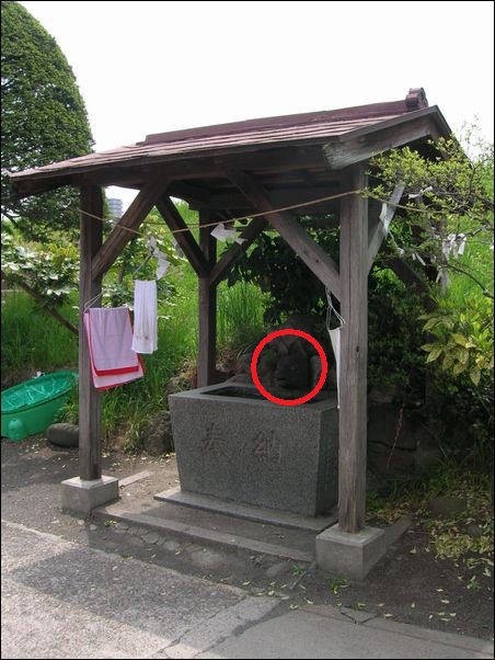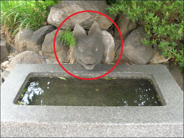 鳥居をくぐって、すぐにあるのだが…。赤丸に注目。