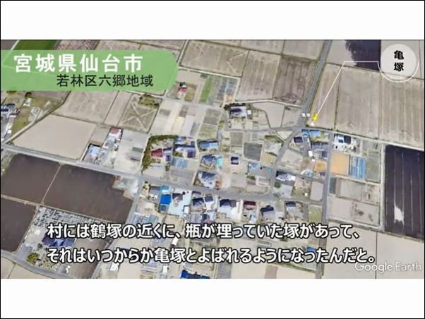 亀塚の場所に関しては、公益財団法人仙台ひと・まち交流財団のウェブサイトに掲載されているので、そちらを参照してください (削除されていなければ、ここをクリックすれば当該映像を閲覧できます)。