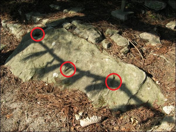 これが、この伝承の石。赤丸が、坂上田村麻呂が残した馬の蹄の跡。