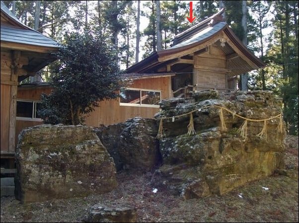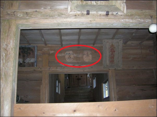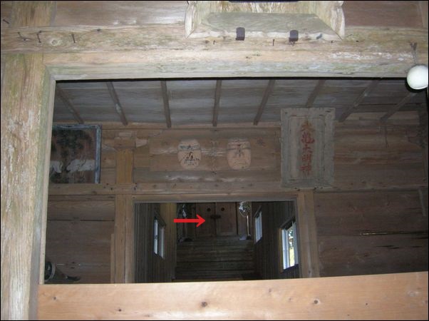 これは、鹿島天足別神社の拝殿の内部。赤い矢印が、本殿。