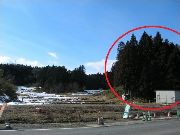 赤い矢印の大きな木が、この伝承の落雷があった木。