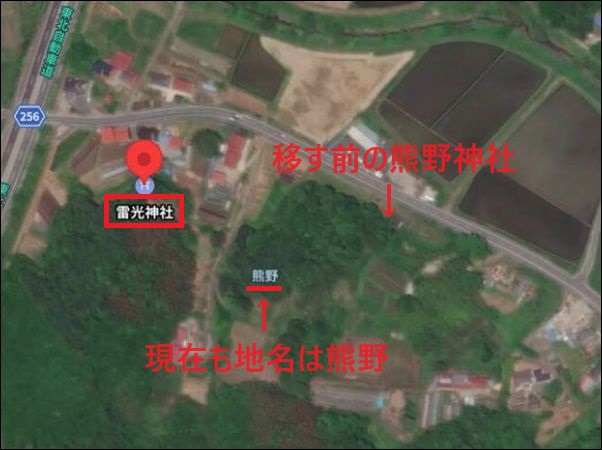 ![]() 雷光神社と、移す前の熊野神社との位置関係。