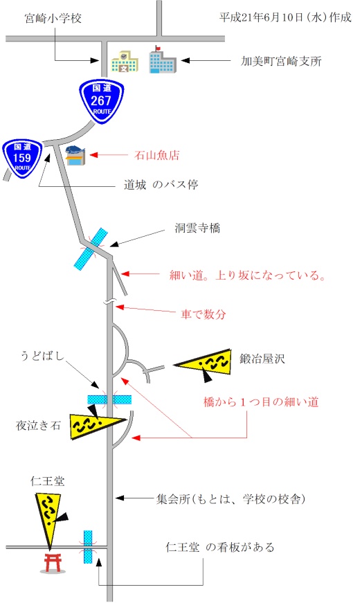 この里の 宮崎 にある湯殿山碑は、 安政 二年に建立されたのだが、その碑を建立するための石は、この里の 北川内 の森の中から四年がかりで運びだしたものであった。そのとき、その森の中には、大きな石と小さな石が仲良く並んでいたのだが、里人たちは、「 湯殿山碑にするんだ、大きな石の方が良いだろう 」と思い、大きい方の石を宮崎まで運んで湯殿山碑にした。ところが、その後、残された小さい方の石の苔が赤くなって枯れてしまったので、里人たちは、「 小さい“ 妻の石 ”が、離ればなれになってしまった大きい“ 夫の石 ”に恋い焦がれて、自らの熱で枯れたのだろう 」と噂した。そして、夜中になると、その妻の石からシクシクとすすり泣く声が聞こえるようになったので、いつしか、里人たちは、この石のことを、“ 夜泣き石 ”と呼ぶようになったという。