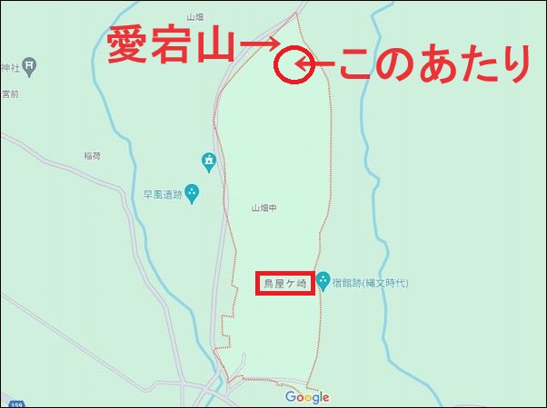 宮崎町史には、「 鳥屋崎の真北、愛宕山の東の山中に長者屋敷があり、屋敷内に十石池がある 」とあるので、上の地図の赤丸のあたりだと推量できる。