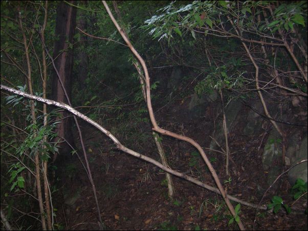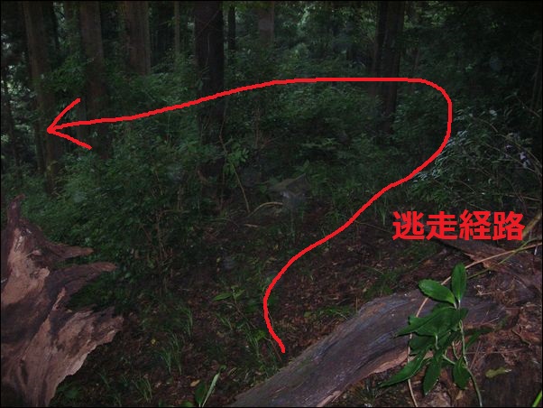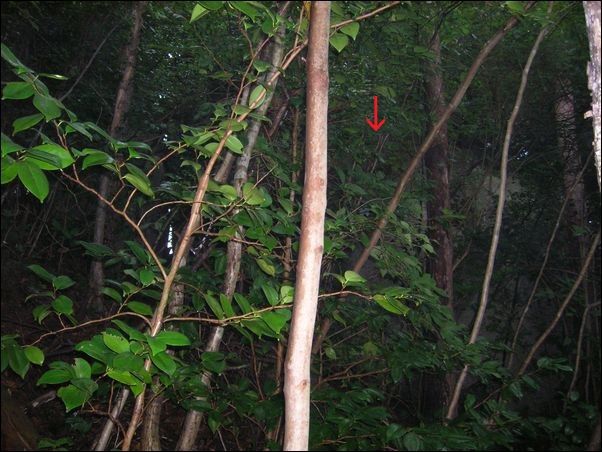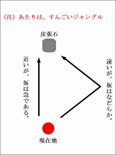 赤い矢印の部分には、木がない。もしかしたら、皮張石や他の大きな石があるために、木がないのかもしれない。結局、皮張石がある正確な位置は分からなかった。やれやれ…。ひどい目に遭った…。