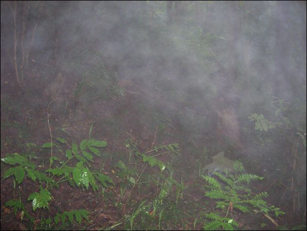 皮張石を正面から撮影してみた。ん? なんか…、霧がかかってる。何で突然…。