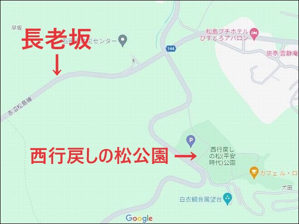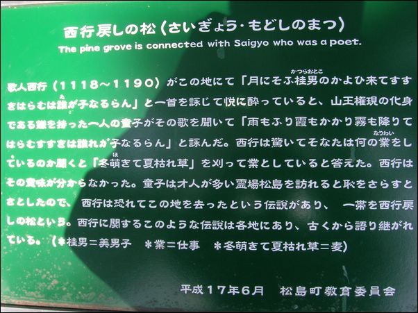 昔、 西行 が、京の都から 松島 に向かって旅をしている途中、 長老坂 にあった大きな松の下で、休憩したことがあった。ちょうど、そのとき、多くの牛を連れた牧童がやってきて、その牛たちに草を食べさせはじめたのだが、しばらくして、一心不乱に草を食べ続けている牛の姿を見た牧童は、「 いつまでも、阿漕に食うものではないぞ! 」と言って、牛に注意を促した。この言葉を聞いた西行は、たいへん驚き、その牧童を見つめたまま、しばらくの間、じっと、その場所に立ちつくした。西行が北面の武士だったころ、 堀川の局 という女性に恋をして、毎日のように、堀川の局の屋敷に通っていたのだが、ある日、堀川の局に、「 あなたは、“ 阿漕 ”な方ですね 」と注意を受けたにもかかわらず、西行には、その言葉の意味がわからなかった。その後、西行は、この失恋によって世の無常を悟り、北面の武士をやめて出家することになるのだが、その原因となった阿漕という言葉を、その十二〜十三歳の牧童は、当然のようにつかっていた。 長い間、疑問に思っていた言葉の意味を知る機会がおとずれた西行が、その牧童に、「 私は、西行という者だが、今、あなたが言った阿漕という言葉は、どのような意味なのですか? 」と聞いたところ、その牧童は、しばらくの間、西行の顔を、じっと見つめて、「 西行さんは、日本の代表的な歌人だと聞いていたけど、こんな簡単なことも知らないとはね 」と言って牛の背にまたがると、「 伊勢の海 阿漕が浦に ひく綱も たびかさなれば 人もこそ知れ( 伊勢神宮の専用漁場である 阿漕ヶ浦 という禁漁区で、何度も何度も密漁をすれば、そのうち人に知れわたることでしょう ) 」と、古歌を詠いながら、長老坂を下っていった。 このとき、西行は、堀川の局が、「 あなたが、毎日、私の屋敷に通ってきたら、そのうち噂になるでしょうね。その前に、やめてください 」という意味で 阿漕 という言葉をつかったことに気づき、自分が優秀な歌人だと思い上がっていたことを深く恥じた。そして、もう一度、歌の修行をしようと決意し、長老坂から松島には向かわずに、休憩していた松の木から京の都に向かって帰ったので、いつしか、里人たちは、この松のことを、“ 西行戻しの松 ”と呼ぶようになったという。