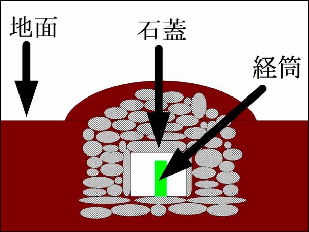 これは、経塚の断面図。青銅製の経筒の中に、法華経十巻が納められている。