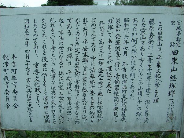 平安末期、「 末法の世になって仏法が衰え、人間の心が荒れ果てた末、世が乱れる 」という末法思想を信じ、これに危機感をもった藤原氏は、大切な経典が失われることを恐れ、 田束山 の頂上に経塚を造って、仏法を後世に残そうとしたという。