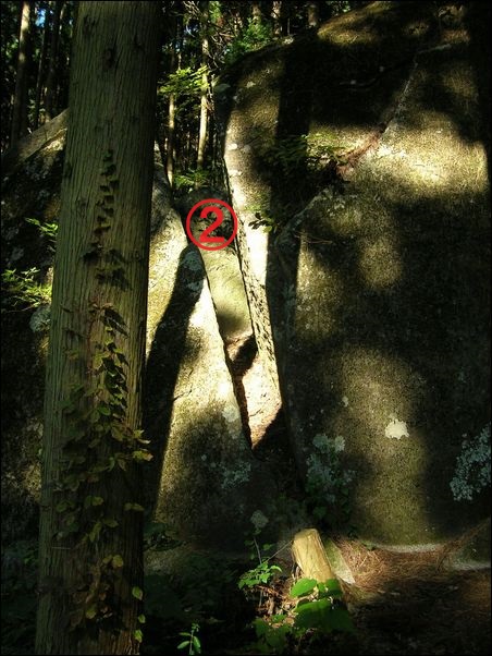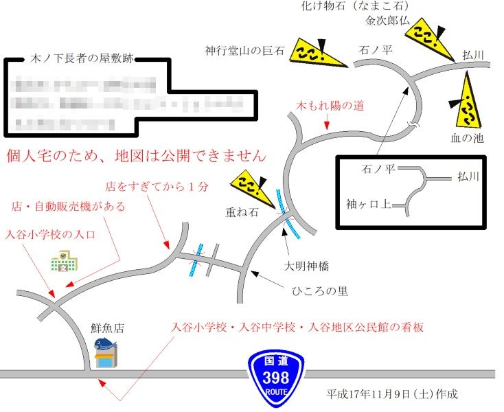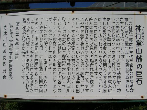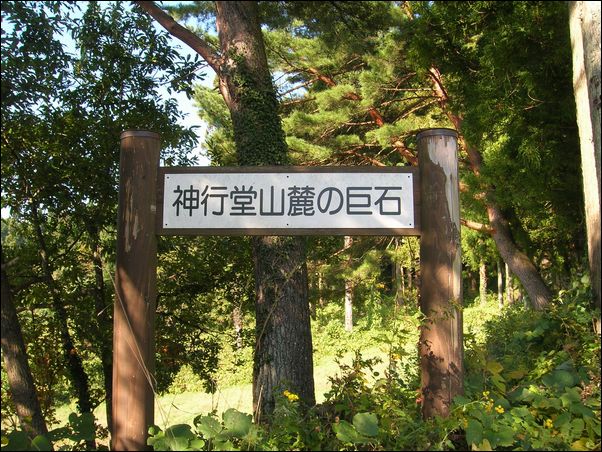 この看板のあるところが、この伝承の巨石への入口。この神行堂山は、“ 石の平 の高野山 ”とも呼ばれており、昔、この山に 弘法大師 が寺を開こうとしたが実現できず、その後、高野山に寺を開いたと伝承されている。