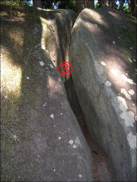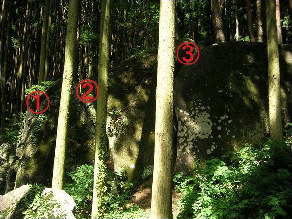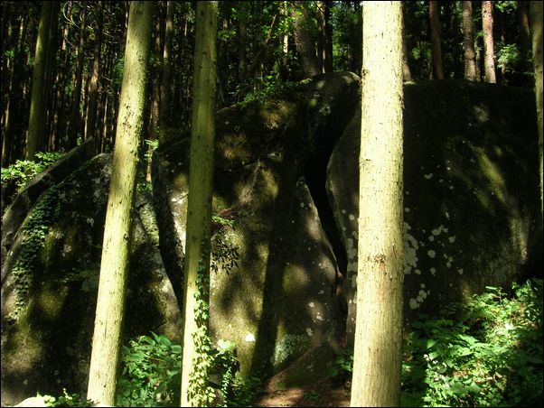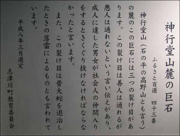 昔、この里にある 神行堂山 という山の麓に、気性の激しい大蛇が棲んでいたのだが、困った里人たちが、ある日、この大蛇を退治したところ、その大蛇の死とともに大きな落雷があり、そのときの落雷によって、近くにあった巨大な石に三つの裂け目ができたという。