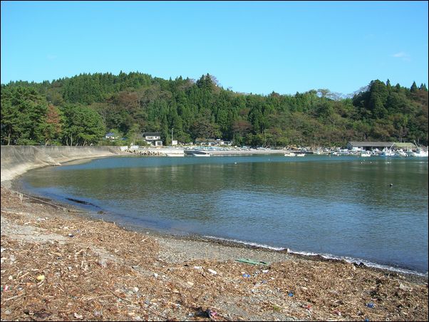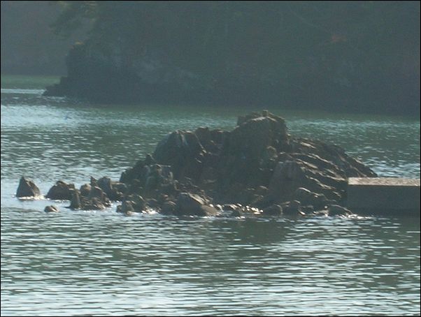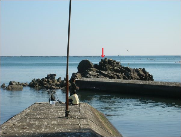 上の写真の赤い矢印が、この伝承の桜川の河口をふさいだ石。里人たちは、この石のことを、