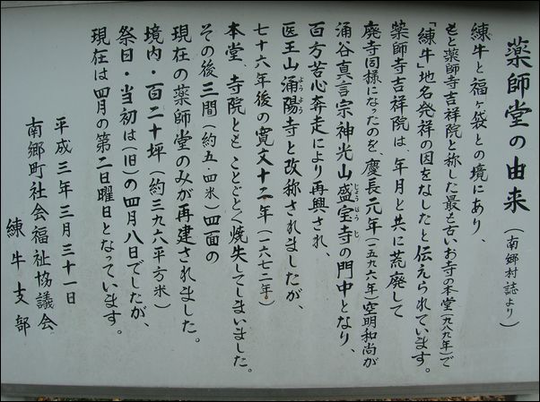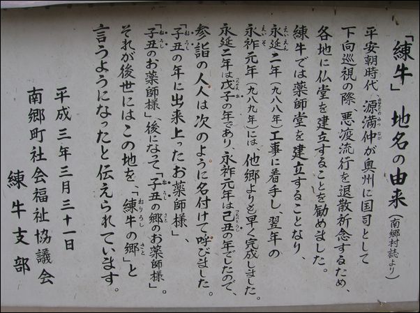 昔、 源満仲 が陸奥を視察したとき、里人たちは、疫病の流行により、たいへん苦しんでいた。そのため、心を痛めた満仲は、陸奥の各地に薬師神社を建てて、里人たちの健康を祈願したのだが、この里に建てられた薬師神社は、 永延 二年( 子の年 )に工事を始め、翌年の 永祚 元年( 丑の年 )に完成したものであった。そのため、里人たちは、この薬師神社を、“ 子と丑の年に完成した薬師様 ”と呼んでいたのだが、いつしか、里人たちは、この子と丑の年に完成した薬師様のことを、“ 子丑の里の薬師様 ”と呼ぶようになった。その子丑の里の薬師様が、後に、 “ ねうし ”となり、さらに、“ 練牛=ねりうし ”になったという。