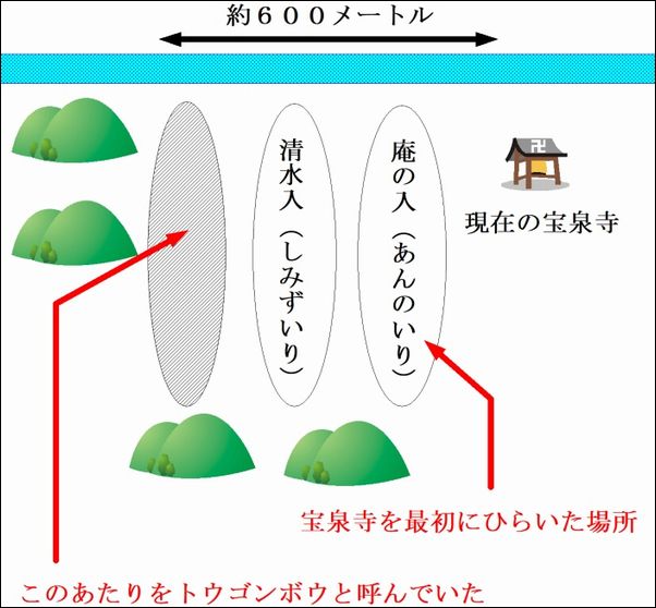 ![]() 上の写真は、宝泉寺の駐車場からの風景。赤い矢印の手前あたりがトウゴンボウ。