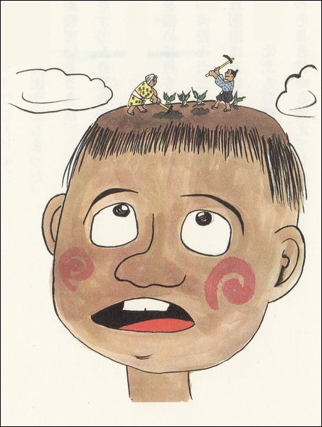 昔、この里に、 頭大きいもん という名前の里人が住んでいた。頭が大きすぎて家に入ることができず、着ることができる服もなかったので、夜、寝るときは、山を枕にして裸で寝ていた。 頭大きいもん が歩くと地震のように地面が揺れ、クシャミをすれば雨が降ったように唾液が飛び散り、オナラをすれば、その臭さは特別なものであったので、里人たちは、たいへん迷惑していた。 頭大きいもん は、お腹がすくと、いつも、里人たちの食べ物を勝手に食べていたので、 「 このままでは、みんなに悪いなぁ … 」 と思い、自分の大きな頭の上を耕して果物や野菜を栽培し、里人たちに無料で分け与えた。ところが困ったことに、 頭大きいもん のせいで、果物屋と八百屋の商品が売れなくなってしまったので、果物屋と八百屋が共謀して、ある夜、 頭大きいもん が寝ている間に大きな穴を掘り、 頭大きいもん の頭を、その穴に埋めてしまった。 翌朝、 頭大きいもん は、 「 そうだったのか … 、それは困ったなぁ … 」 と呟き、今度は、果物屋と八百屋が掘った穴に水を入れて魚を飼い、その魚を里人たちに無料で分け与えた。すると、今度は、魚屋の魚が売れなくなってしまったため、魚屋は、その穴を埋めて魚を飼えないようにした。穴を埋められて魚が飼えなくなった 頭大きいもん は、何か思うところがあったのか、静かに里を去り、その後、二度と姿を見せることはなかったという。