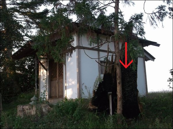 しかし、焼けた杉の一部が、里人たちによって保存されていた。赤い矢印がそれ。