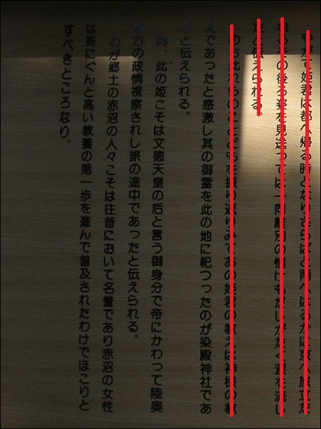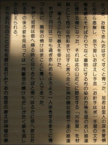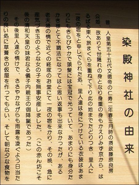 仁寿 年間、ある沼の近くで、妊娠している女性が、お産のための宿を探していた。ところが、その女性は、あまりにも身なりが豪華で、とても普通の旅人とは思えなかったので、里人たちは、警戒して宿を貸さなかった。しかし、その女性を哀れに思った老夫婦が、お産のための宿を貸してくれたため、その女性は、その宿で安産し、元気な赤ん坊を産むことができた。その後、生まれた赤ん坊を見ているうちに、里人たちの心も和んできたため、里人たちは、この女性と赤ん坊のために、新しい小屋を建てたり、食べ物を貢いだりして、いろいろと世話をしはじめた。すると、その女性は、里人たちに感謝し、その御礼に、里人たちに裁縫や手芸などを教えたため、里人たちは、他の里では見られないほどの教養を身につけることができた。その女性と赤ん坊が、この里を去った後、里人たちは、その女性が、お産で汚れた衣類を沼で洗ったとき、沼が赤く染まったのを思い出したので、いつしか、里人たちは、この沼のことを、“ 赤沼 ”と呼ぶようになったという。