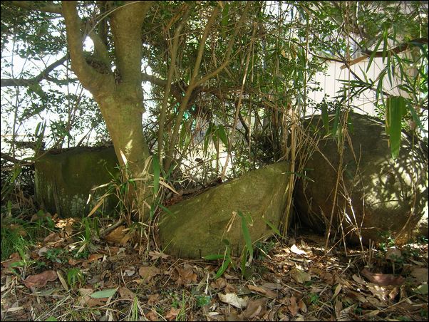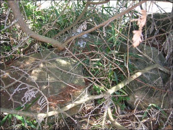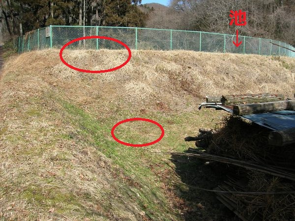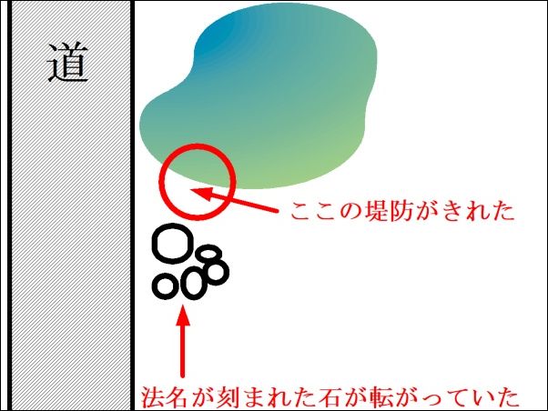 これが、その池。上の赤丸のあたりが崩れて、水があふれだした。そして、下の赤丸のあたりに、法名が刻まれた石があった。