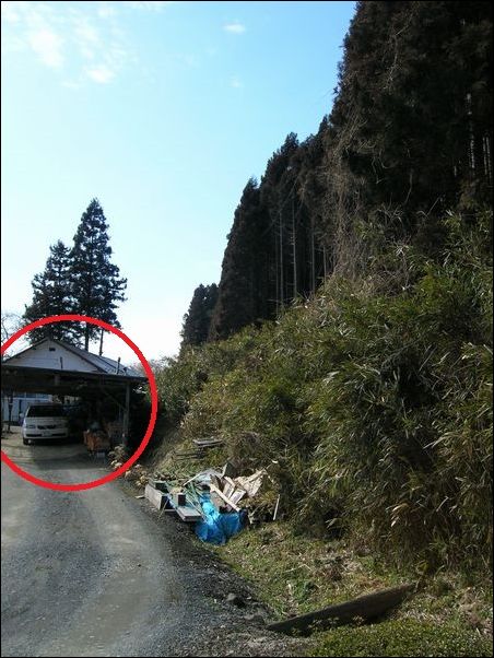 上の写真の右は、愛宕山。赤丸は民家。この民家と愛宕山の間には湧き水がでていて、この民家では、その湧き水を使用しているのだが、今までに、一度たりとも、この湧き水が涸れたことはなく、ときどき、この湧き水を通しているパイプの中に、小さな蟹が入っていることがあるという。