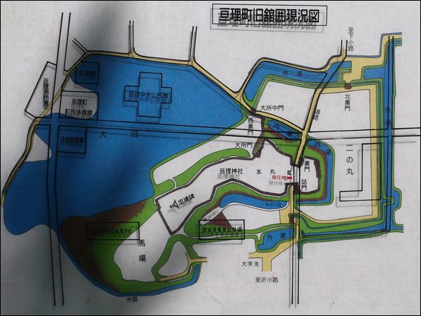 これが、臥牛城の全体図。現在の地図と重ねてある。現在、本丸跡は、
