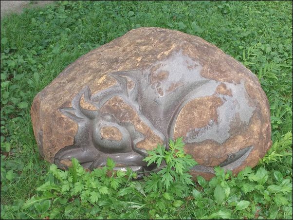 伏している牛が刻まれた石。