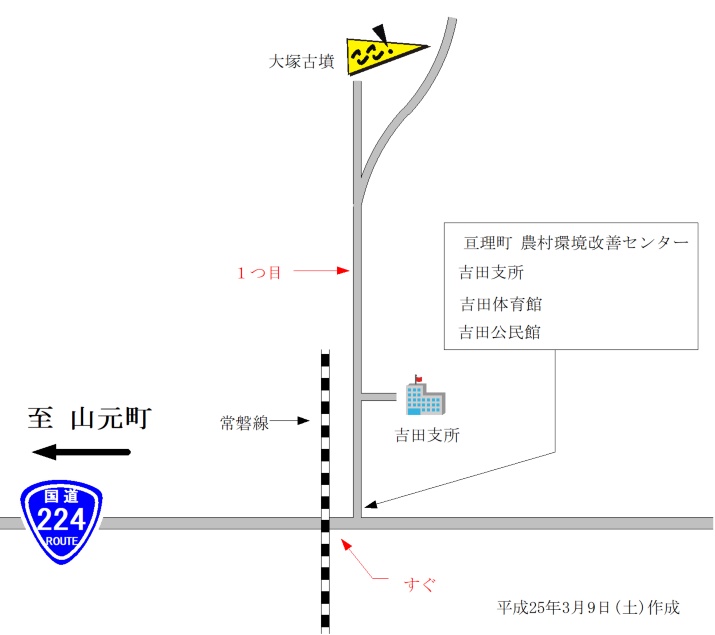 この伝説に関して、わたりの民話には、 「 旧吉田村役場の近くにあった塚で … 」 とあるのだが、現存しているのか、現存していないのかが分かりにくい文章になっている。古老の話によると、 「 旧吉田村役場の近くで、塚というと、 “