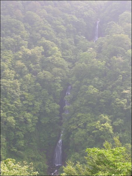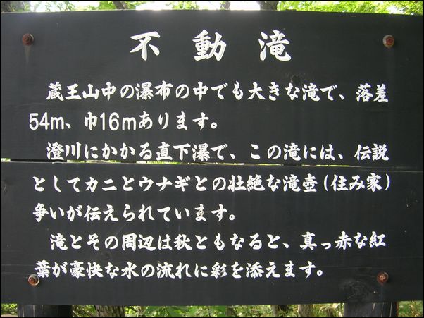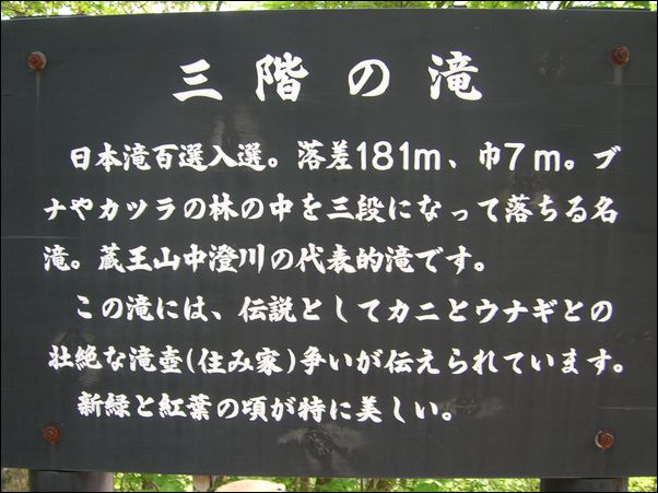 昔、この里にある 不動滝 には老いた鰻が、隣り合わせの 三階滝 には老いた蟹が棲んでいて、お互いに勢力を競っていたのだが、ある日、その力の均衡が崩れて、三階滝の蟹が、不動滝の鰻に攻撃を加えるようになった。ある夜、不動滝の鰻は美女に変身して、近くに住んでいる猟師の家を訪れ、「 今夜、三階滝の蟹が、私を襲いにきます。どうか、私に力をかしてください 」と加勢を頼んだところ、その猟師は、「 これは、面白いことになってきた 」と、好奇心から、この依頼を快諾した。そして、その夜、猟師が不動滝に行くと、すでに、血生臭い風が吹いていたので、「 もう、不動滝の鰻は、殺されてしまったのかな? 」と思って、不動滝の滝壺を見てみると、不動滝の鰻は、三階滝の蟹の鋭い鋏で八つ裂きにされていた。そのとき、三階滝の蟹が、すごい形相で猟師を睨んで威嚇したので、驚き恐れた猟師は、一目散に逃げ去った。この夜から、七日七晩、この川の水は、殺された鰻の血で真っ赤に染まったという。
