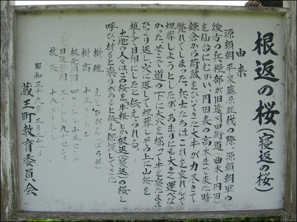 文治 五年、 源頼朝 の奥州征伐のとき、鎌倉から荷駄をひいてきた大きな牛が、この里で力尽きて死んでしまった。武士たちは、この牛を埋葬しようとしたのだが、その牛が大きすぎて運ぶことができなかったため、道の近くに大きな穴を掘り、この穴の底に牛を転がして埋葬し、その上に桜の木を植えて、ねんごろに弔った。そのため、いつしか、里人たちは、この墓のことを、“ 寝返しの桜 ”と呼ぶようになったという。
