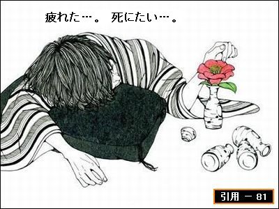 私が必要としている幸福は、ただ自動的に与えられた、そのような偽物の幸福ではなく、たとえ七転八倒しながらでも、自分自身の頭で考えて行動し、人生の岐路では自分自身の決断で道を選択し、ある一定の場所に到達する。それが、私の幸福である。自分自身の体を痛めつけ、自分自身の心を傷つけた末に辿り着くのが、幸福という場所なのである。その一定の場所が、自分が望んだ場所なのか、そうでない場所なのかは関係ない。結果は関係ないのである。自分で考えて、自分で決断する。それこそが、“自分らしく生きる”ということであり、そのように生きている人間こそが、真に他人に優しくできる“他人に望まれるような人間”になれるのである。私が死ぬ時、恐らく後悔はしていないであろう。失敗ばかりの人生だが、私が自分の頭で考えて生きた結果である。私は、その全ての結果を受け入れて死んでいくつもりである。 2015/09/25