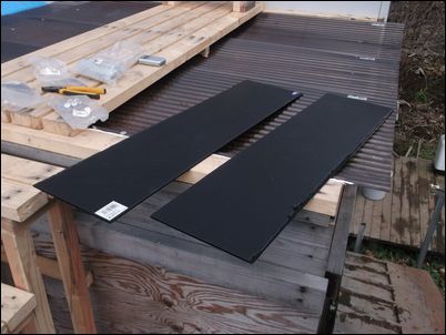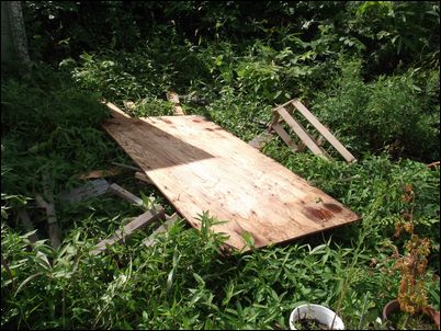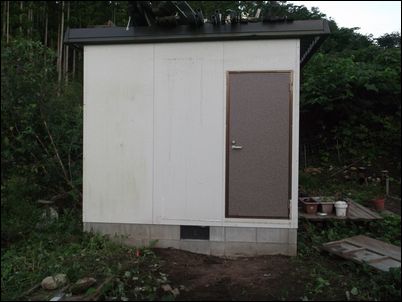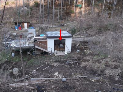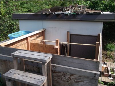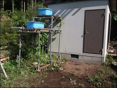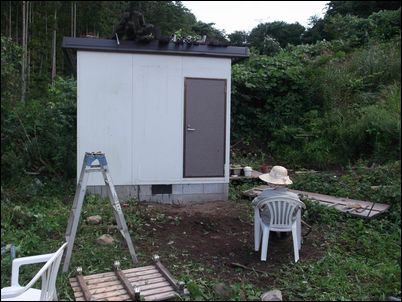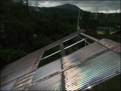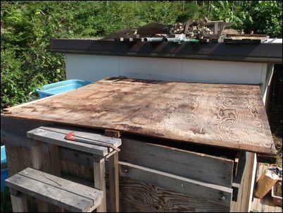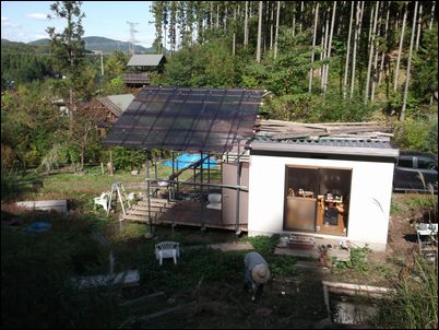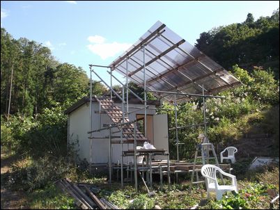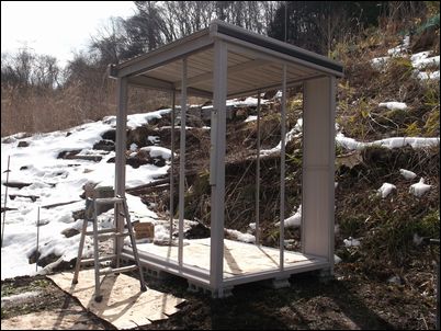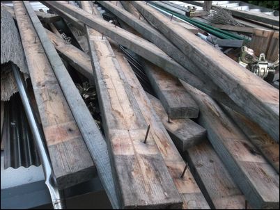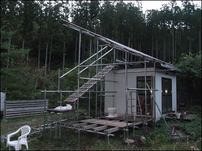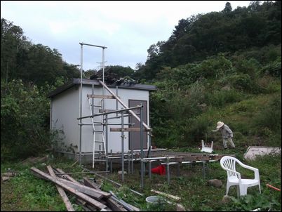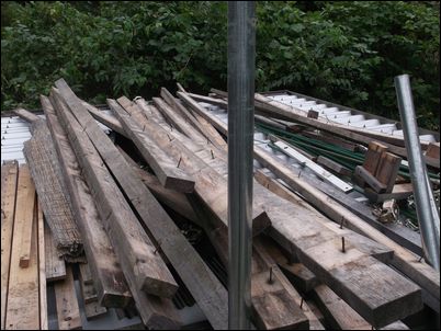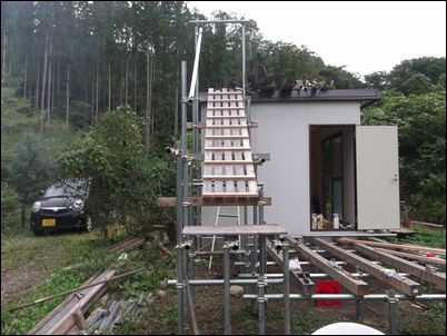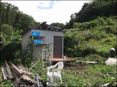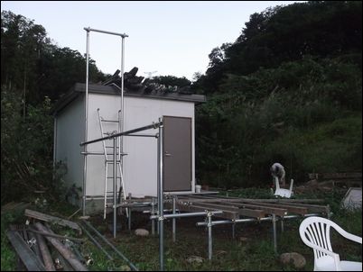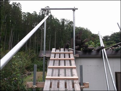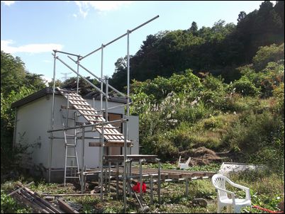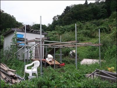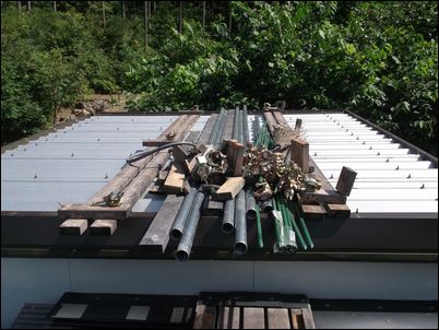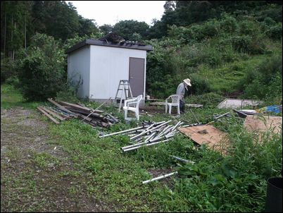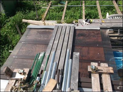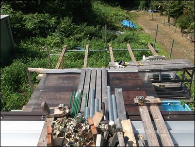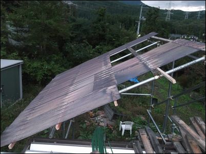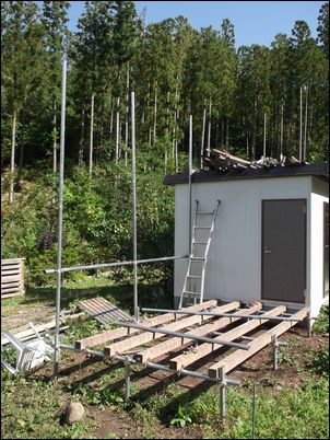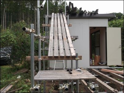解体した木材などは再利用するので、プレハブの屋根に保管しておく。
