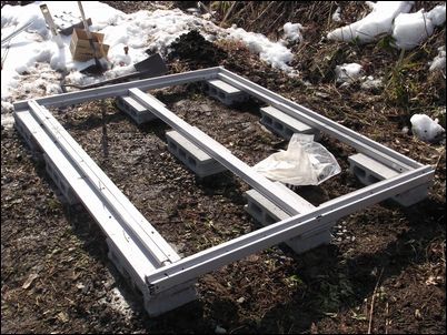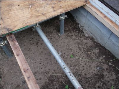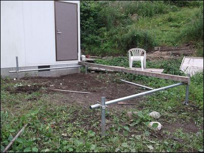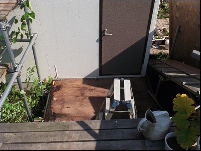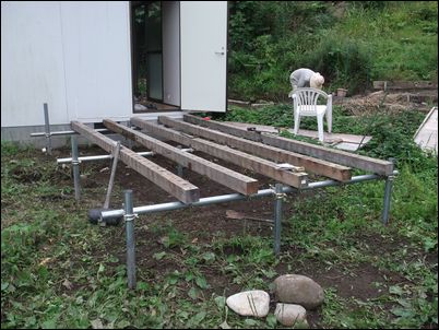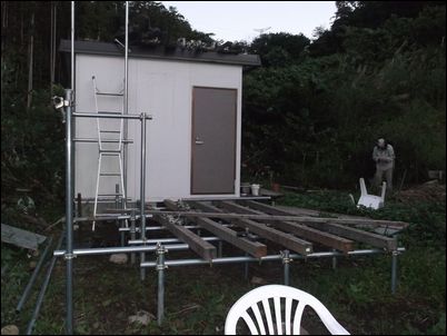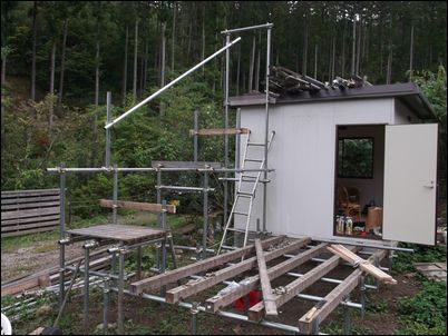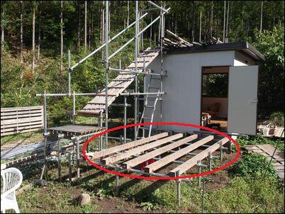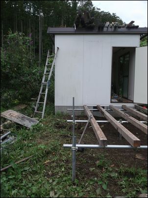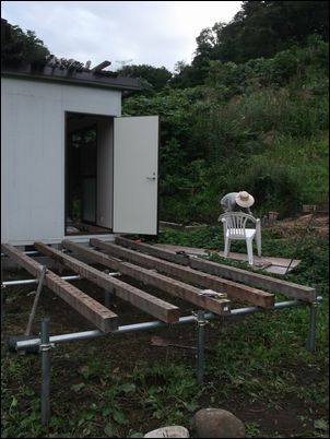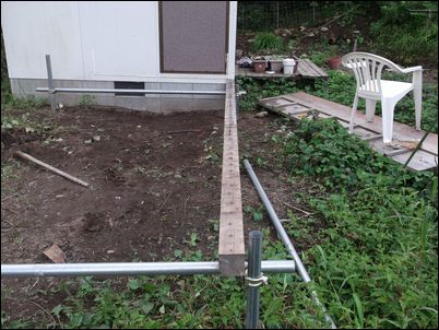 床を支える木材を設置。プレハブの壁と一直線にする。