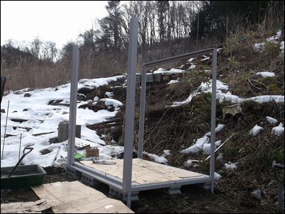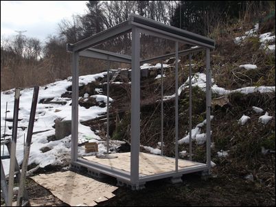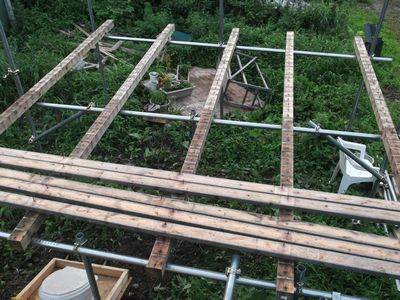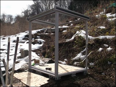 暮露暮露庵の再建計画の続きである。単管パイプの骨組みに木材を取り付けて、ポリカを張っていく。