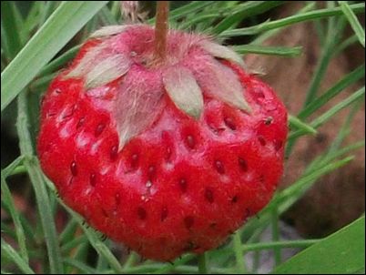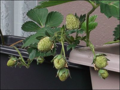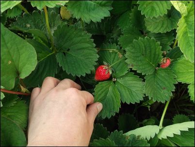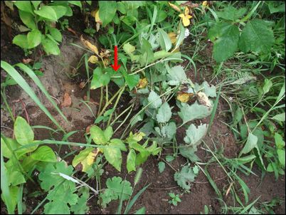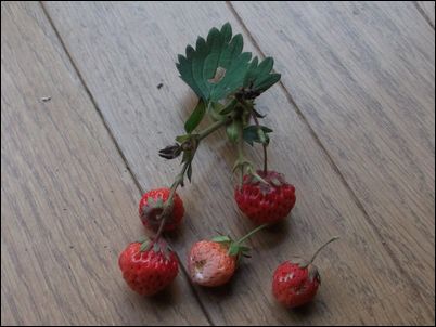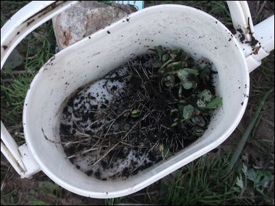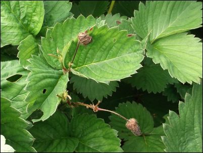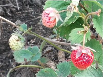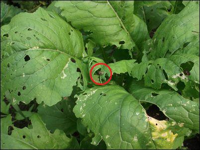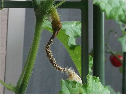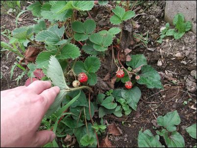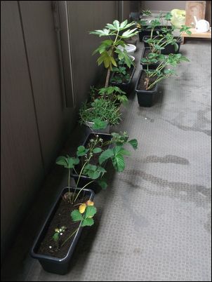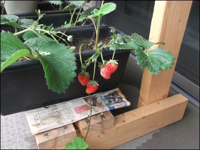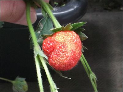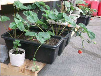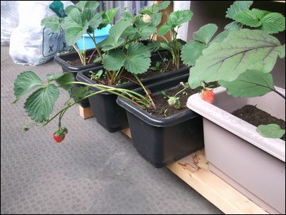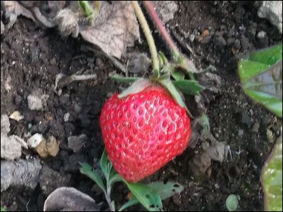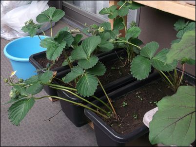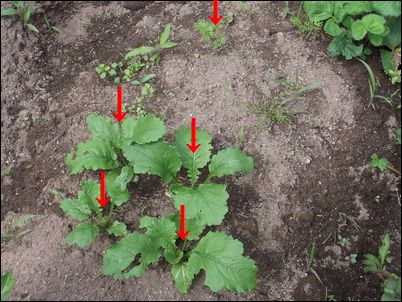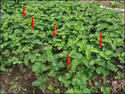何の虫だろうか…。因みに、矢印はイチゴの苗。ここまで生長していたとは。