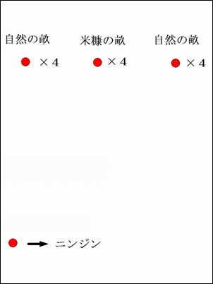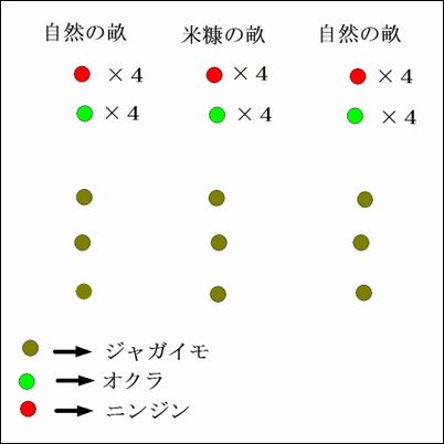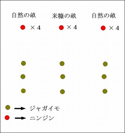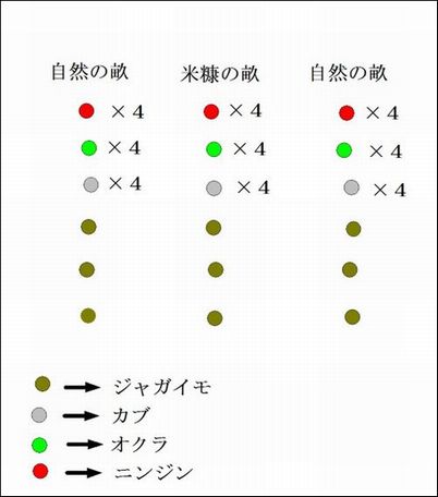 左から、自然の畝・米糠の畝・肥料の畝で収穫したニンジン。