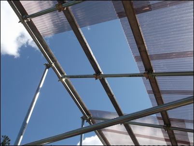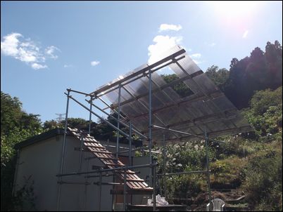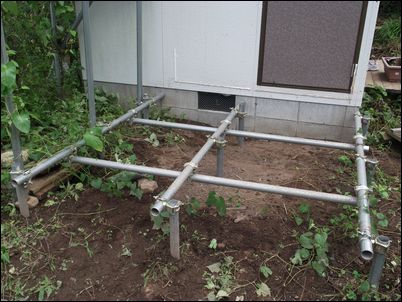 ふぅ〜、屋根の骨組みがほぼ完成したので、次回はポリカーボネートなどを張っていく♪