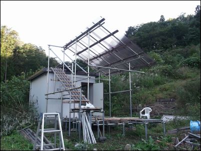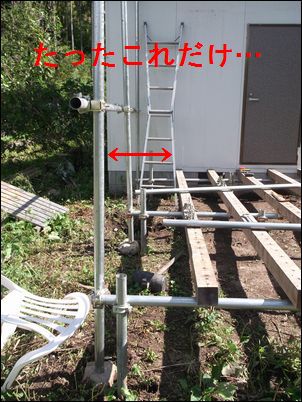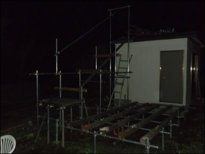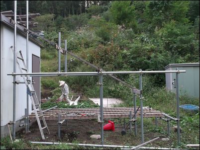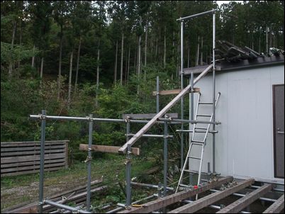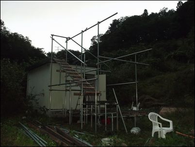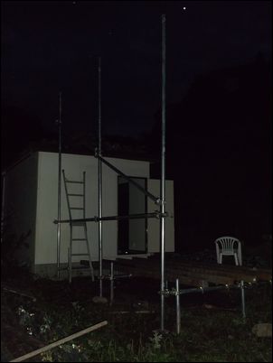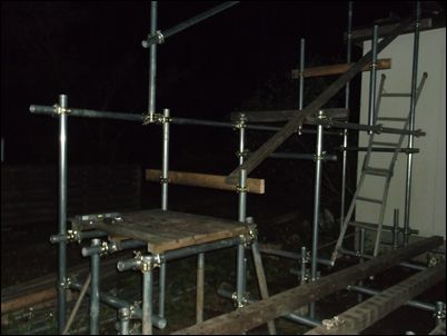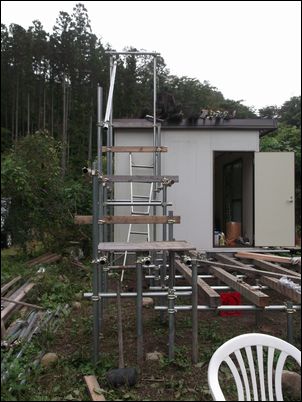 階段を作るために、高さ4メートルの支柱を建てた。暗くなったので、今日はここまで♪