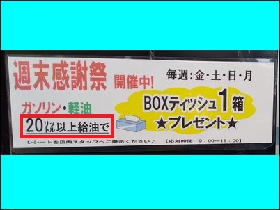 0.1リットル足りなくてボックス・ティッシュをもらえなかった。