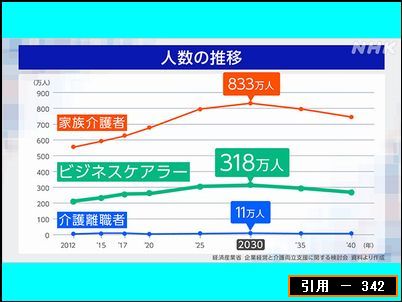 ![]() 認知症の母を介護するために離職した私からすると、仕事をしながら家族を介護できる方たちは、かなり恵まれた環境にいるように見える。ビジネスケアラーの方たちが生産性を低下させているのは事実だと思うが、私のように介護離職した人間は、各種の保険料や税金が減免されるなどの措置で国の財政に負担をかけているため、その生産性はゼロにも及ばず、マイナスにまで低下している。さらに深刻なのは、このビジネスケアラーの方たちは、将来、仕事と介護を両立させる負担に耐えきれずに離職してしまうかもしれない、“介護離職予備軍”でもあるということである。因みに、現在、1年間に約10万人というペースで介護離職者が増え続けている。 テレビなどで、介護関係の専門家の方たちが、「介護離職は避けた方が賢明です。介護のために収入がなくなって経済的に困窮すると、その経済的な困窮は介護が終わってからも続き、経済的に困窮したまま、今度は自分が介護される側になるという可能性が高くなります」という主旨の解説をしているのを見ることがあるが、介護離職する人間は、それらのことを十分に理解している。しかし、どんなに正しい話を聞かされても、実際には、介護離職という一択しかないから離職するのである。介護離職の危険性の説明に力を注ぐよりも、1年間に約10万人というペースで介護離職する人間が増え続けているという事実に着目し、ビジネスケアラーの方たちの介護離職を防ぐ対策の実行に力を注いでいただきたい。 私たちのように介護離職してしまった人間は、もう助からない。しかし、「介護離職した人間は、働きたくないわけではないし、働く能力がないわけでもない。ただ、介護という鎖で手足を縛られ、身動きがとれないだけである」ということだけは、忘れないで欲しいものである。 2024/06/02