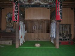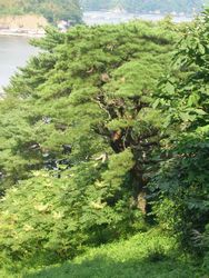 応永 年間、漁師が漁をしていると、大きな亀が網にかかった。 不思議なことに、その亀の背中には、 薬師如来 像がのっていた。恐ろしくなった漁師は、大島の領主であった菊田義演に、このことを届け出た。 義演は、「 これは、数年前、私が 比叡山 延暦寺 から 拝受 した薬師如来像だ。大島へ帰る途中、『 縁があったら、 陸奥 の大島まで来てください 』と念じて、琵琶湖の底に沈めた。それが、今、私を訪ねて来たのだ 」と言った。 そして、薬師堂を建てて、祀った。 薬師如来像をのせてきた亀は、すぐに死んでしまった。 義演は、この亀を手厚く葬り、近くに二本の松を植えたという。 いつしか、 里人 たちは、その松を、“ 葡萄 の松”とも“如来の松”とも呼ぶようになった。 参考『 大島誌 』