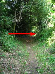 これが、西光寺本堂の西側にある道。矢印のあたりに墓がある。