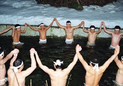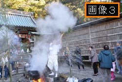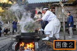 宮司が熱湯に笹の葉の